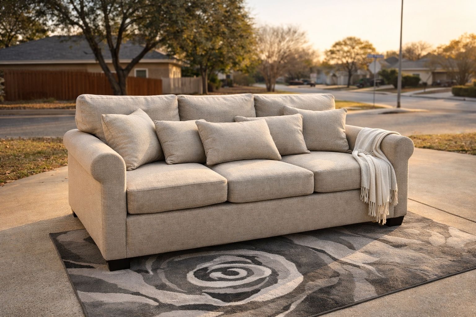 Beautiful neutral beige sofa in great condition. Very comfortable with deep cushions and modern rolled arms. Perfect for a living room, apartment, or office space. The neutral color matches almost any décor. Delivery Available