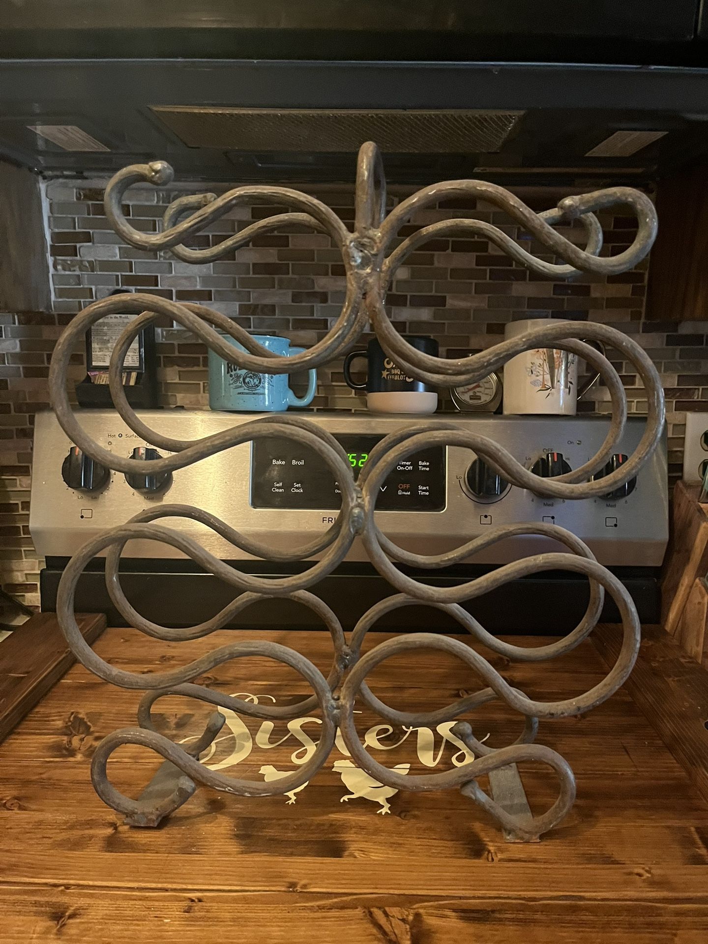 I live in Mesa at University and Stapley Drive 85203 Please read all of the information in the description and look at the pictures before you message me. Thank you. Serious buyers and 24 hour pick up This is a very unique wine rack. It is handmade. You can use it as a wine rack/towel rack where you can roll up the towel and slide it in or use it for anything you like. It is 19 inches tall 16 inches wide and 4 1/2 inches deep. I am selling it for only $10. Please check out my other items and follow me