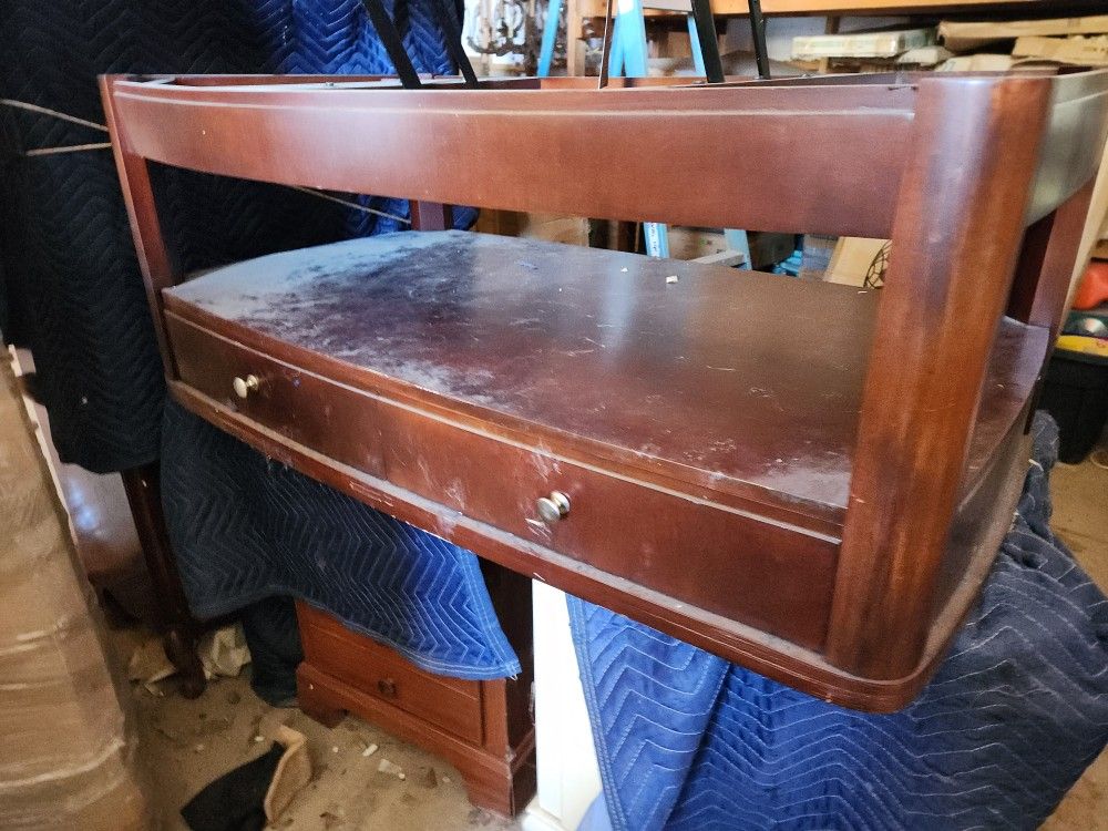 Solid Cherry wood coffee table. Has drawers along bottom and top lifts up with storage inside. 20" x 46" x 28"