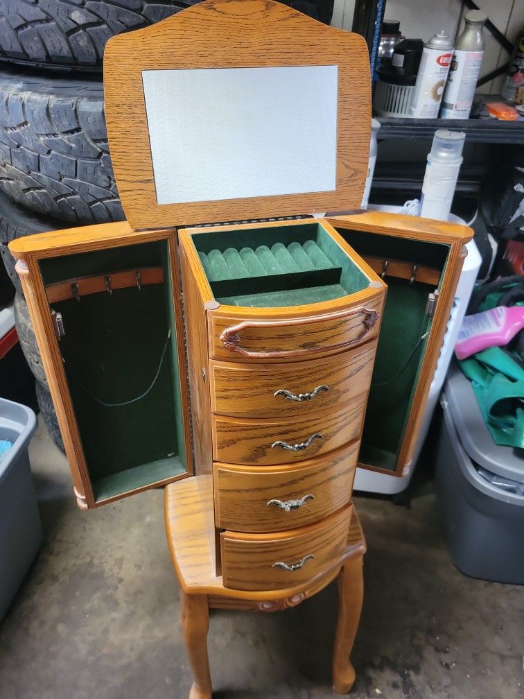 PRICE REDUCTION****Wooden jewelry stand with side fold out compartments for necklaces, pop-up mirror with ring holder and 4 drawers.