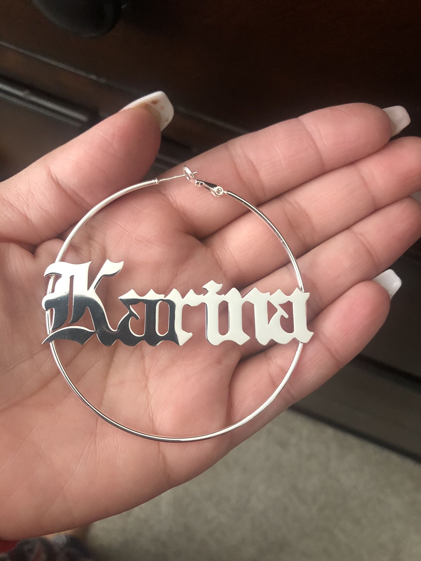 Brand new name jewelry Sterling silver hoop earrings with the name Karina on them. I ordered them but came in bigger in size than I like to use. Asking only 15obo