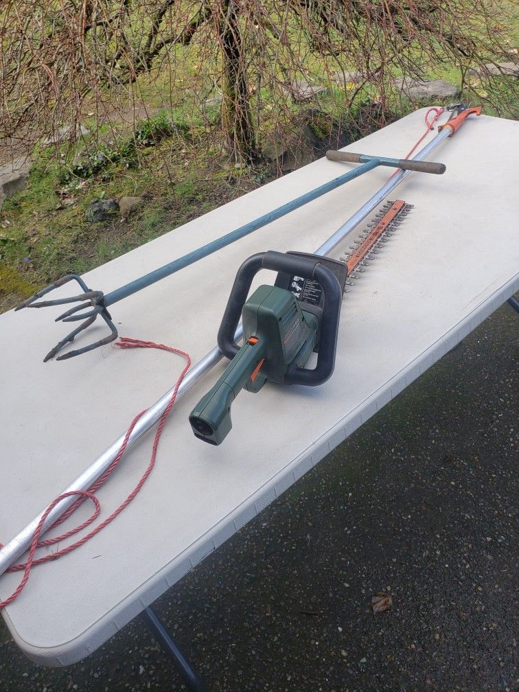 Used good working condition 22" hedge trimmer, hand manual cultivator, tree pruner length 78 inches, see pictures for details OBO