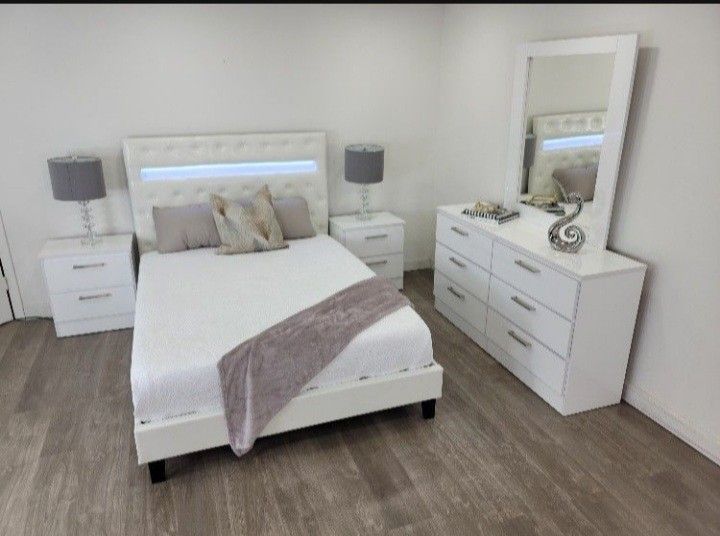 INCLUDES ⚪️ •QUEEN SIZE BED •DRESSER WITH MIRROR •TWO NIGHTSTANDS (MATTRESS NOT INCLUDED)
