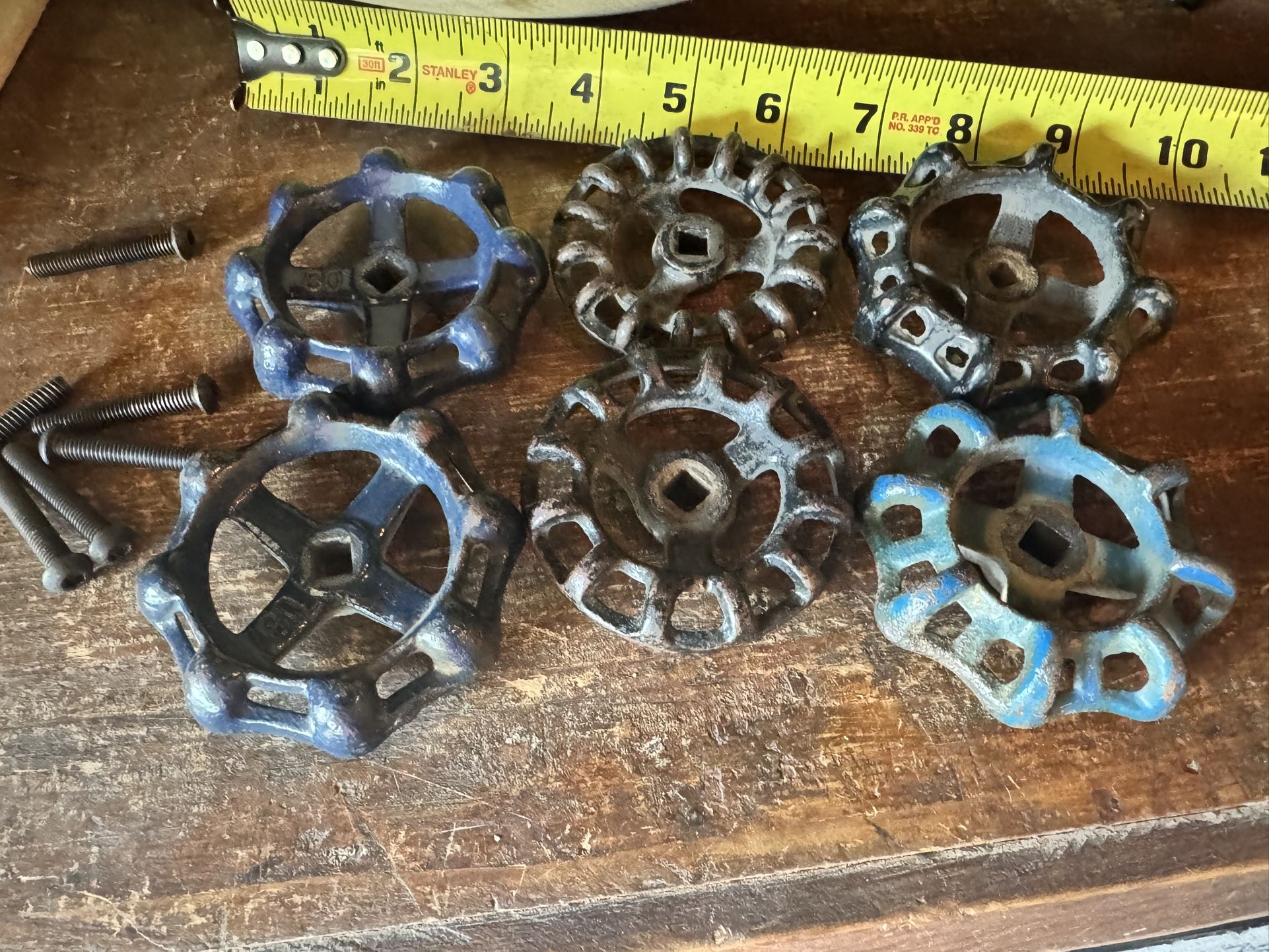 6 vintage outdoor hose spigot handles. Industrial/steampunk decor. I used these as drawer handles on a dresser (can give you the screws with them that I used).