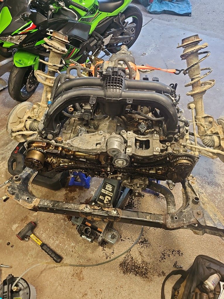 ORDERED NEW FRONT TIMING CHAIN COVER. 2.5L Subaru engine with transmission. 170,000 miles, runs and drives. New cover on the way, then will be ready to go. Sub frame not for sale