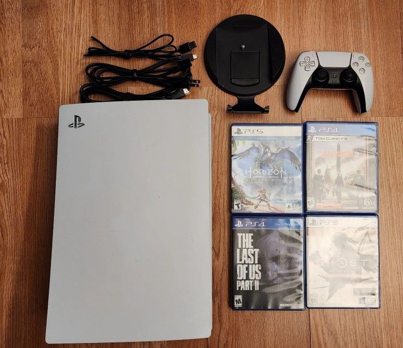 Up for sale is a Sony Playstation 5 bundle. It is used, but in perfect working order. Please take a good look at the photos as they show the exact condition in which you will receive the items. This bundle was adult owned/used. Includes everything pictured. Console has been updated to latest system software. Model: CFI-1015A 825GB SSD Disc Version Includes: - PS5 Console - OEM PS5 Controller - HDMI, USB-C controller charge cable, and Power ac cable - Stand - 4x Games: Horizon: Forbidden West, Division 2 (ps4), The Last of Us II (ps4), Ghost of Tsushima Asking: $340 OBO Low ballers will be ignored/blocked