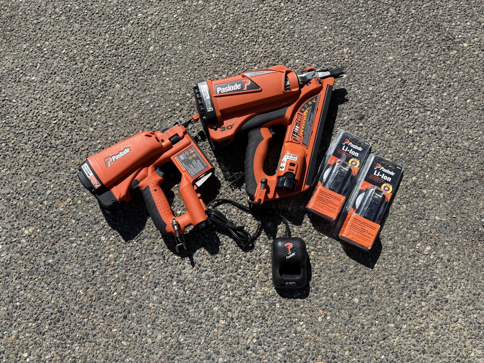 Very nice paslode XP framing gun and paslode 18S 18Ga Brad finish nailer. Both guns work perfectly, VERY LIGHT WEAR IF THERE EVEN IS ANY… BOTH GUNS LOOK PERFECT, WORK PERFECT!!! No cracks, no visible scratches, no rust guns we’re always garage kept. $325 for both guns. *** 4 batteries total, 2 brand new (sealed) and 1 in each gun. Not really looking to separate but open to offers. Thanks NO LOW BALLING PRICED EXTREMELY FAIR!!