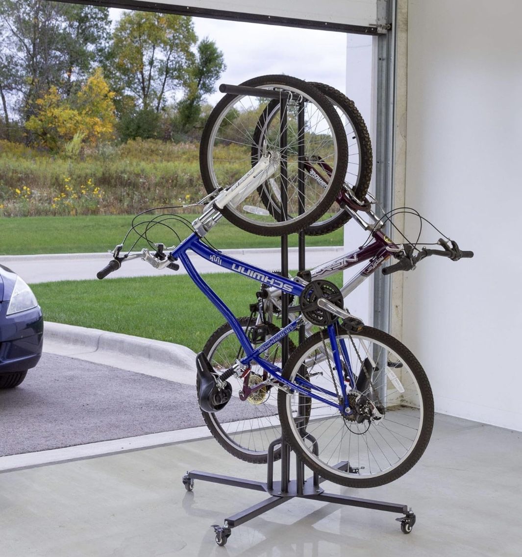 Bike Rack with Wheels makes it easy to move around. Holds all size bikes and 4 -6 bikes depending in sizes. Hang by wheel front or back wheel on padded pole.