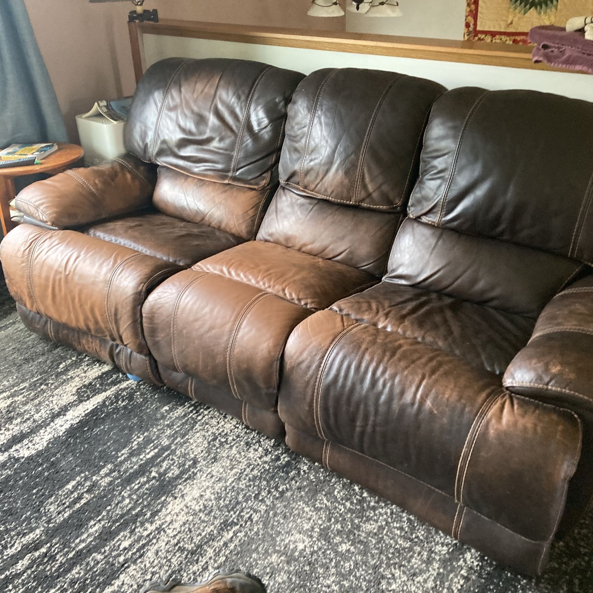 1 Costco leather dual recliner. Not cut or damaged. Worn as shown Both recliners work. Second couch reclines no middle seat. Possible delivery for fee