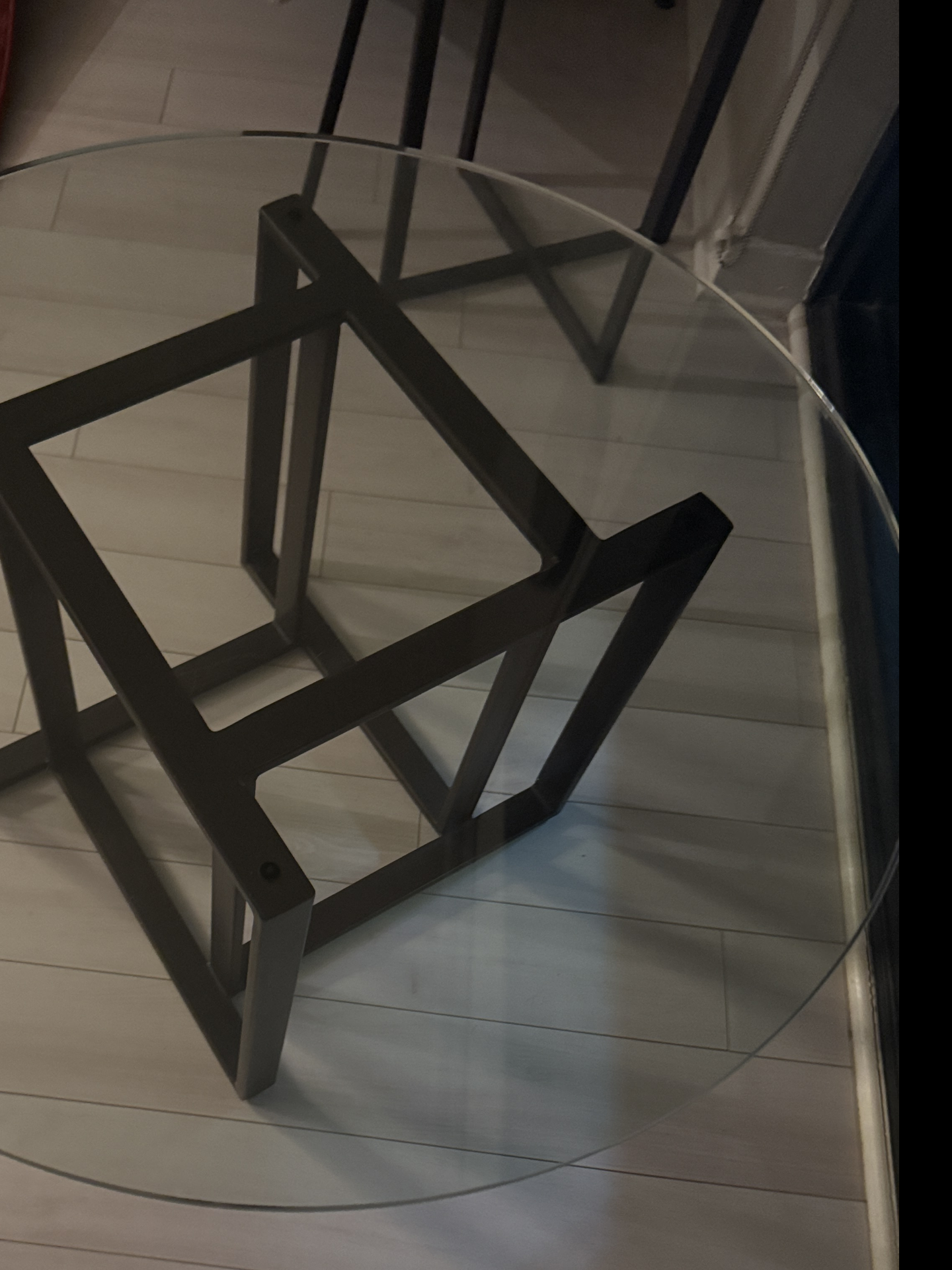Iron and Glass Center Table from Create & Barrel. Original price $300 Dimensions 34X17 and the Iron stand is black. NO PHISHING