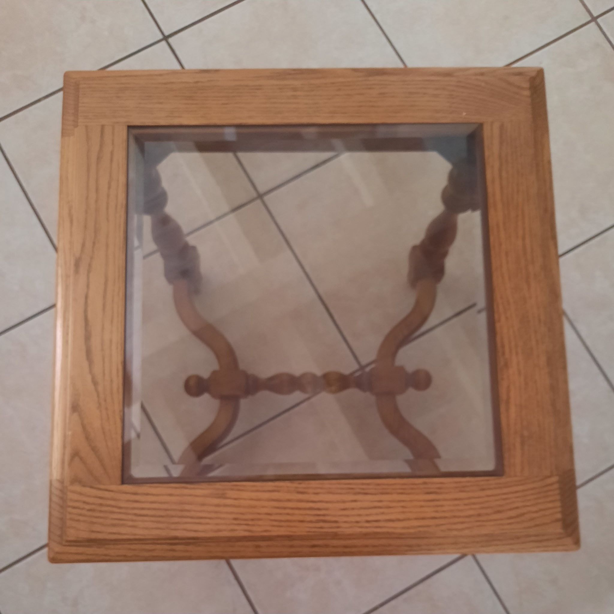 Solid wood side table with a glass top. Real wood frame with turned legs and a sturdy cross-brace base. Glass insert is in good shape with only minor surface wear. Table is clean, stable, and ready to use. Would be great for living rooms, bedrooms, or as an accent table. Dimensions: about 22.5 in x 22.5 in x 21.5 in.
