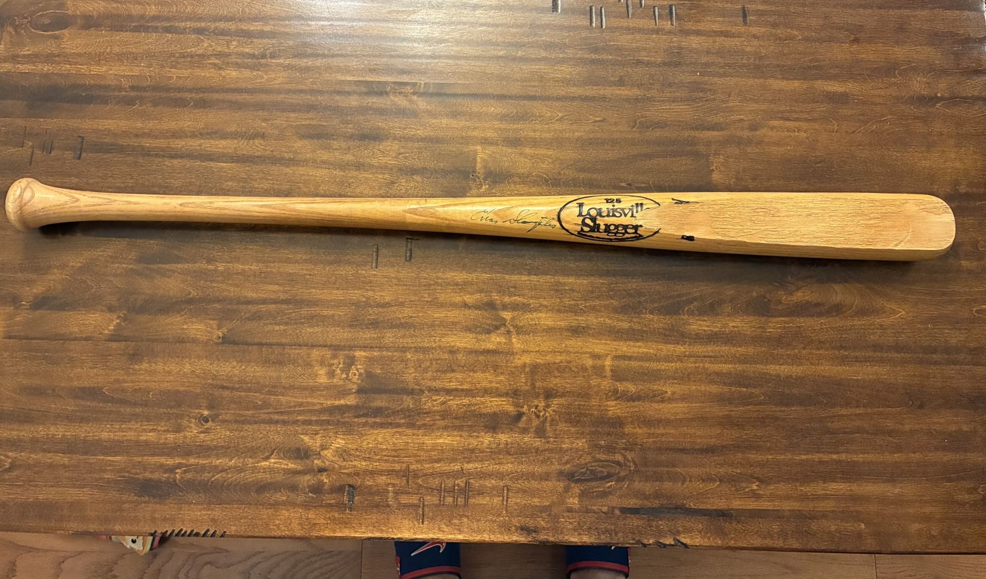 Fungo baseball bat autographed by Enos Slaughter. Slaughter played in the MLB for 19 years and is best known for scoring the winning run in the 1946 World Series. I had him sign the MLB fungo bat when he visited New Port Richey in 1989.