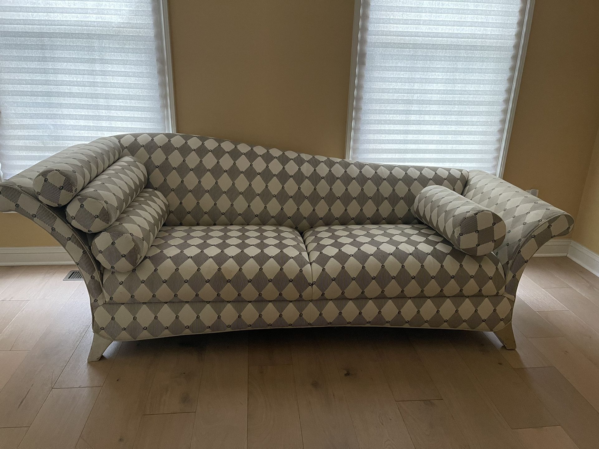 Unique and high quality sofa that’s too small for current space. She’s in very good condition.