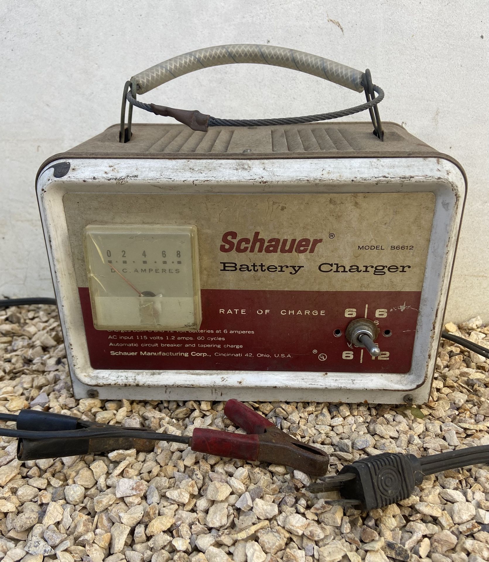 Selling a TESTED AND WORKING Schauer Model B6612 battery charger with grab-and-go top handle. - Charges both 6 volt and 12 volt batteries at 6 amperes (6 amps) - AC input 115 volts (115 V), 1.2 amps, 60 cycles - Automatic circuit breaker and tapering charge - From the Schauer Manufacturing Corp. in Cincinnati, Ohio, USA Cord has splice. Feel free to message me with any questions.