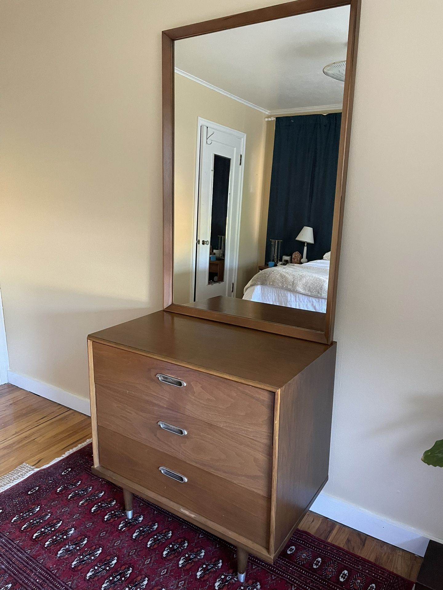 Real vintage MCM 3 drawer dresser with mirror and attaching bracket. Some scuffs on side and top (pictured) but otherwise in great shape. Heavy, real wood (unclear on type). Must take both pieces for sale, will not sell separately. Mirror and drawers are currently separated for transport. Attaching bracket included. Pick up only, delivery not available.