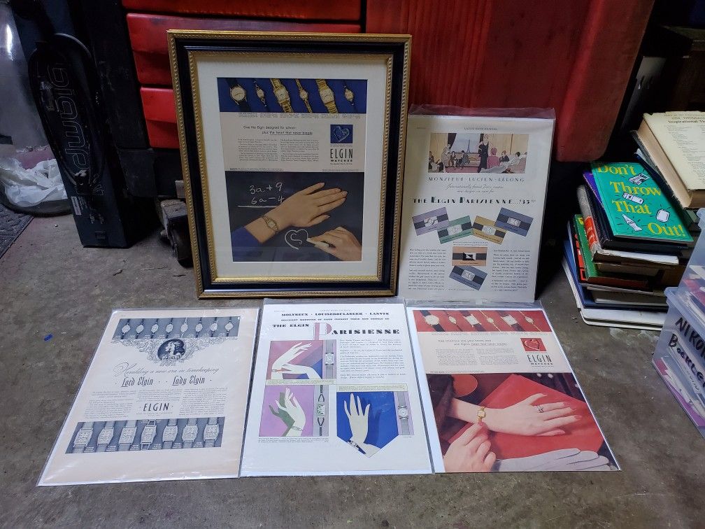 Lot of Vintage 1920's era Elgin Watch Company Advertisements Framed
