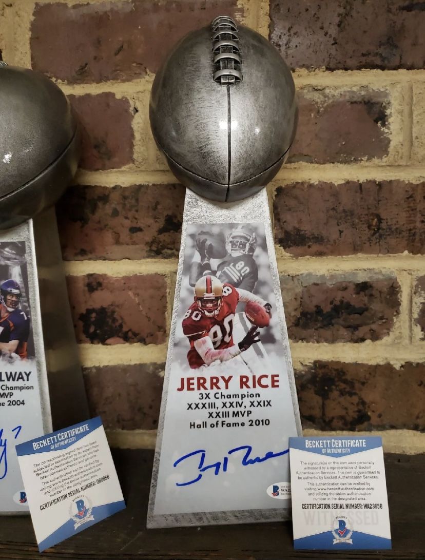 COA- Beckett | autographed Vince Lombardi replica trophies San Francisco 49ers HOF WR Jerry Rice $250 Denver Broncos HOF QB John Elway $250 New York Giants HOF LB Lawrence Taylor $300