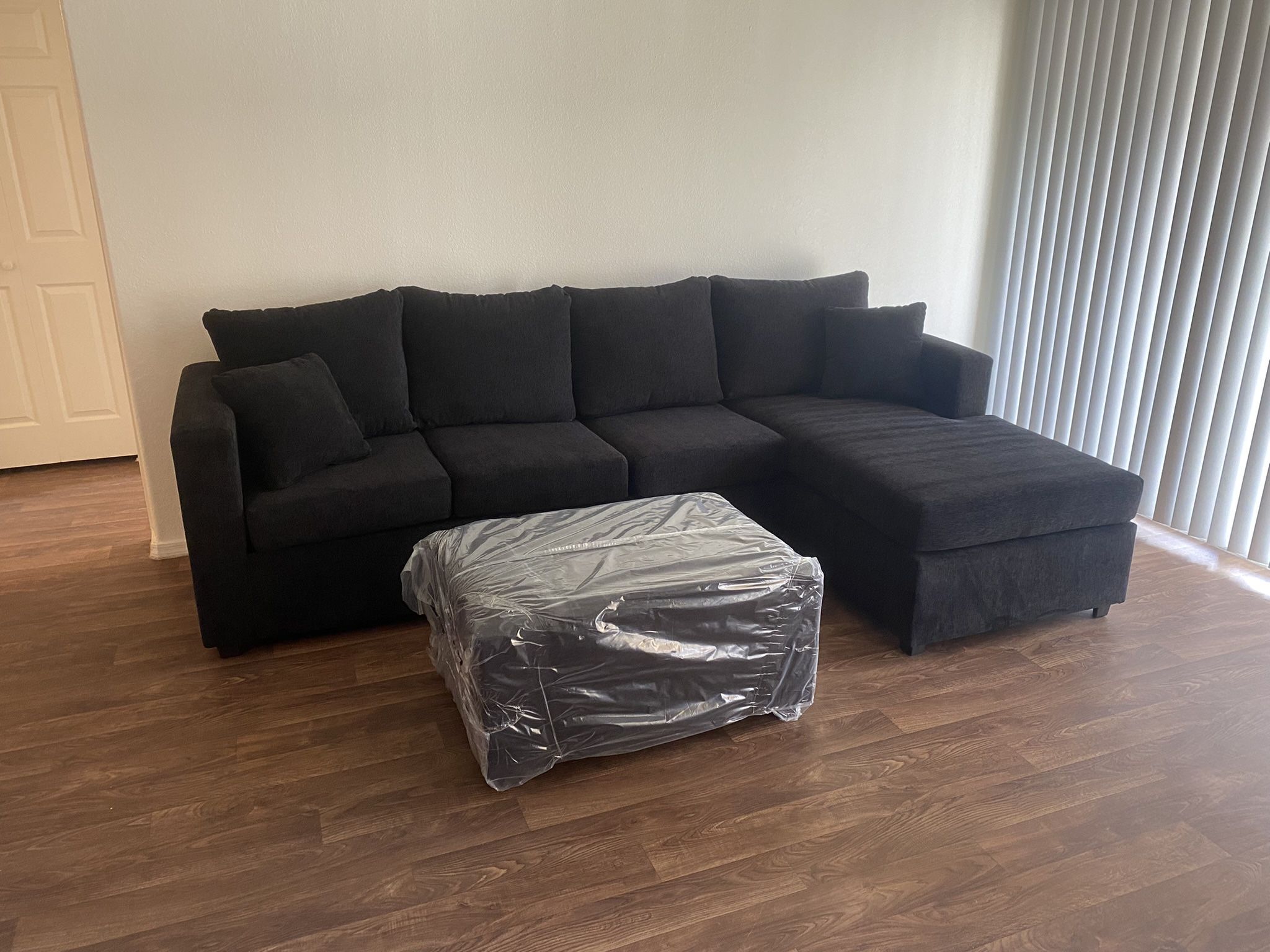 Black sectional with ottoman ‼️NEW in stock ‼️ Available colors ✅ black ✅brown ✅cream ✅grey ‼️Take it home with only $39 easy approval ‼️ 100 days same as cash no interest Come pick up or ask for delivery 🚚 Completamente nuevos Ven por el o pregunta por tu entrega 🚚