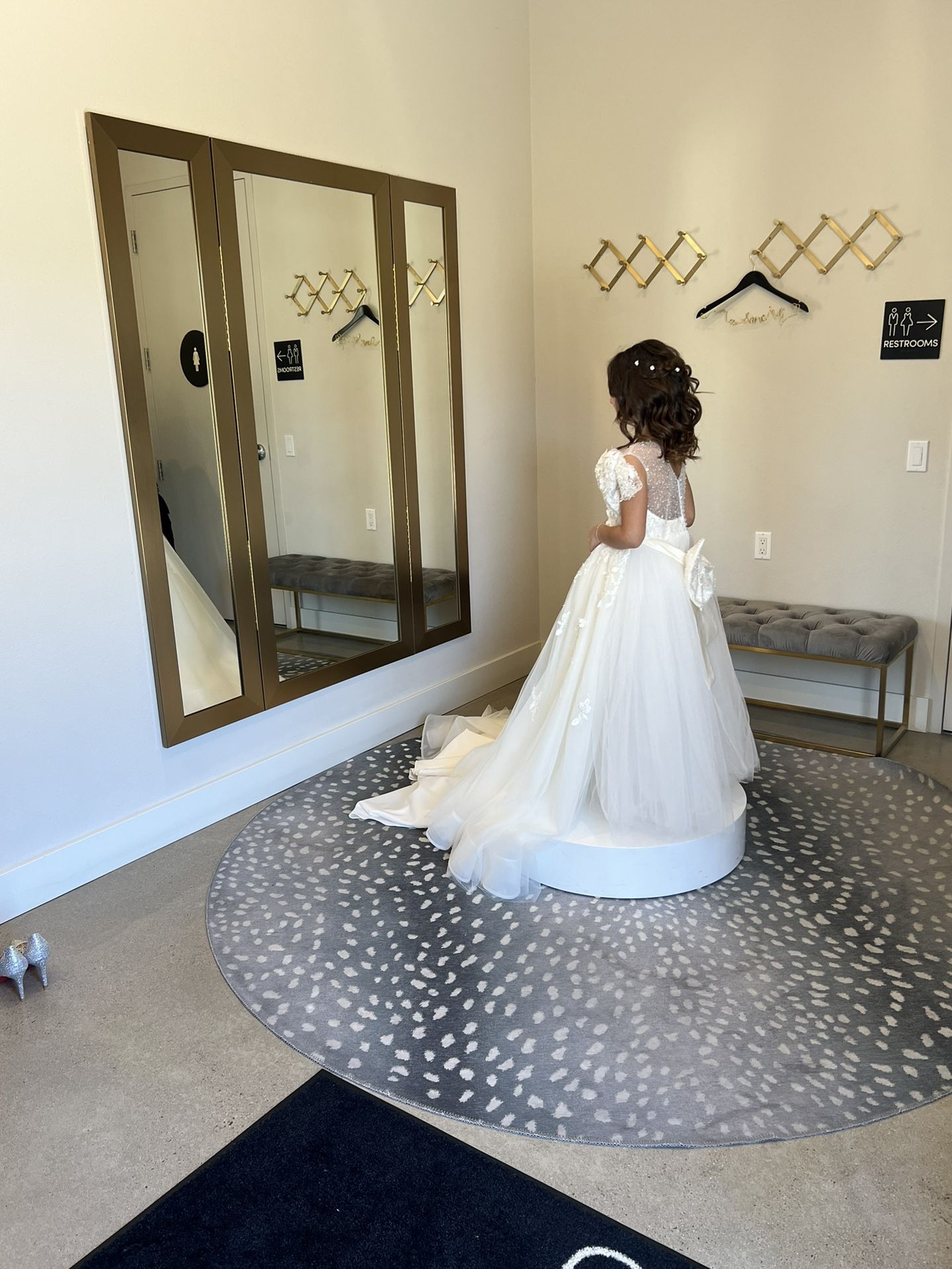 SO BEAUTIFUL!!!! Size 8-ivory Buttons in the back and a beautiful bow