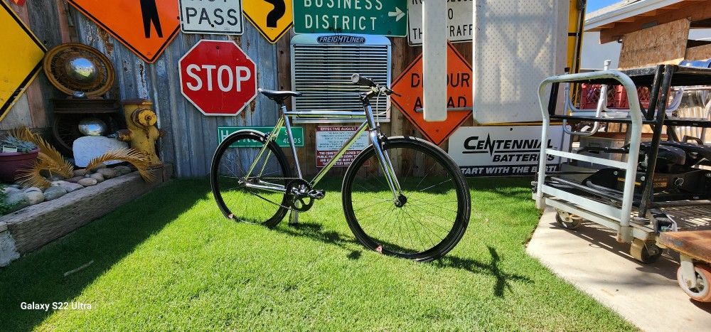 Slim chrome racing bike in full effect. It has the promax break system in the front and back. Narrow retrospect seat and quando axle. Heng shen tire with neco handlebar post. Tires: inflate to 100 psi, (700x250) racing slim narrow light exercise riding retrospect OBO Plymouth14 inch Gate piece fence panel security arched rusty outdoor home improvementBlack cargo luggage travel suitcase rooftop opening closingBooks library room shelving decor bookcase Wooden White chairs porch rocker set of 2 Bucket garden plant holder flower pot Shop oil rag box value red trash can storage barter Fold up beer metal black party man cave she shed hang out Picnic patio yard Work out treadmill step physical therapy stretch white metal portable safe strength free yard sale Garage sale cheap fitness health adjustable gas shock resistance tools car truck storage trade junk Rims diesel hub aluminum wheels semi tools shinny polished steel billet custom Vintage rusty classic old iron hot plate blue antique trade barter rustic gold metal relax lounge kitchen farm house cast bike lowrider motorcycle quad dirt cheap project camper rv rc accessories classic Mercedes Benz hub caps chrome shiny lowrider bagged laid out