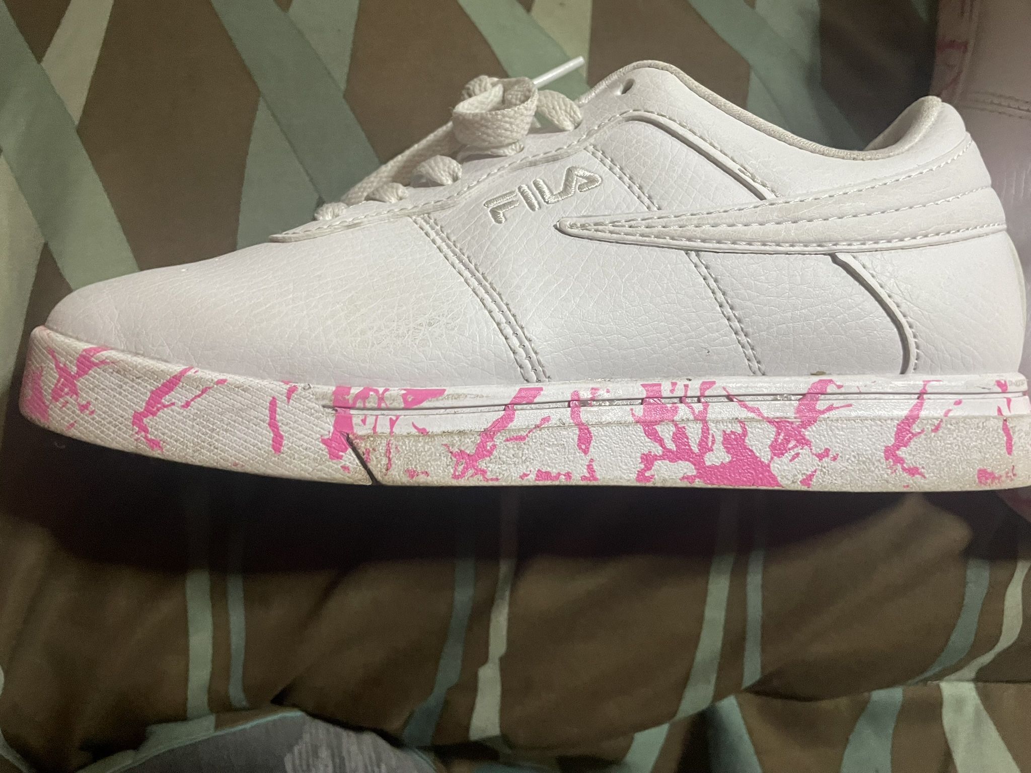 Stylish pink and white Fila sneakers. In good condition, with a few signs of wear, including scuff marks on the toe of one shoe, which adds to their unique look. Great for everyday wear. Brand, model, color, and size can be found in the title. Make me a offer