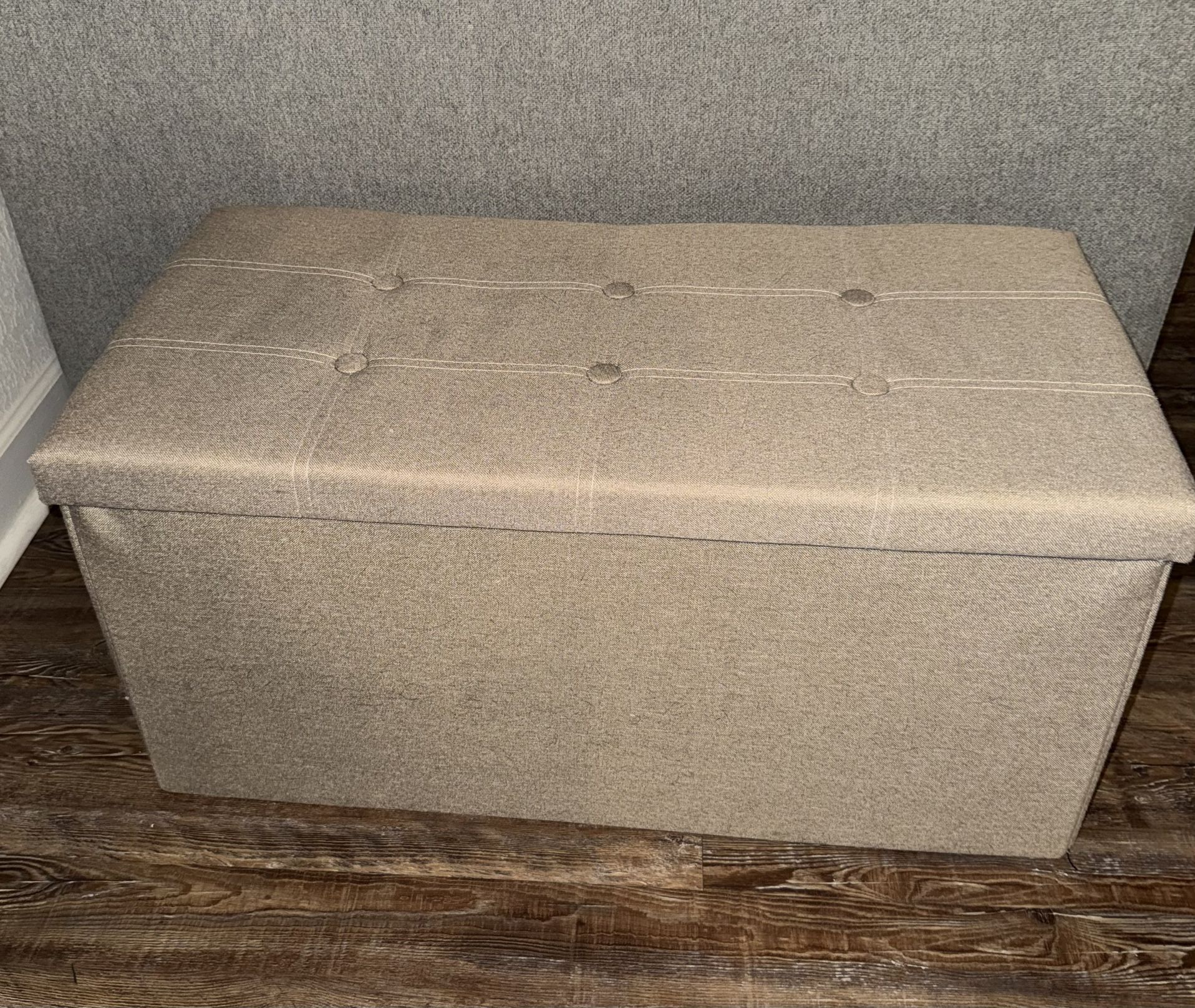 23 GALLON STORAGE SPACE: Hidden storage to reduce mess, the large ottoman bench provides ample storage space for organizing , sheets, pillows, blankets or magazines neatly. STURDY SEATING: The Ottoman with storage crafted with Medium Density Fiberboard, high end imitation linen fabric and sponge padding brings great seating experience; practical used as a shoe bench, footrest seat and console table. SECONDS TO ASSEMBLE: The storage bench can be easy set up and assemble in 1 minute, suitable for living room, bedroom, entryway, dorm and more. Easily folded flat when not in use, keep it behind the door to saving space. EXCELLENT FOR SMALL SPACES: When set up, the storage ottoman measures 30”L x 15”W x 15”H and only 30”L x 15”W x 2.5”H when folded with a weight of 11 LBS; Max weight capacity is 350 LBS. There is a little bit of pet hair on it