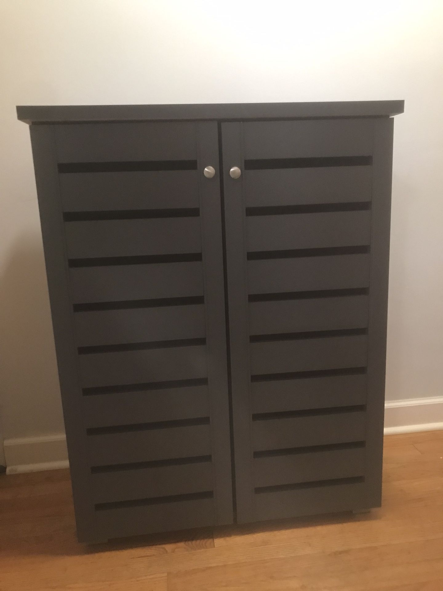 4 shelves Color :dark gray PVC : legs Slatted doors for ventilation Material : engineered wood in a dark gray finish. Height 39 1/2” inches Length 30 1/2 “inches Width 13 1/2 “inches