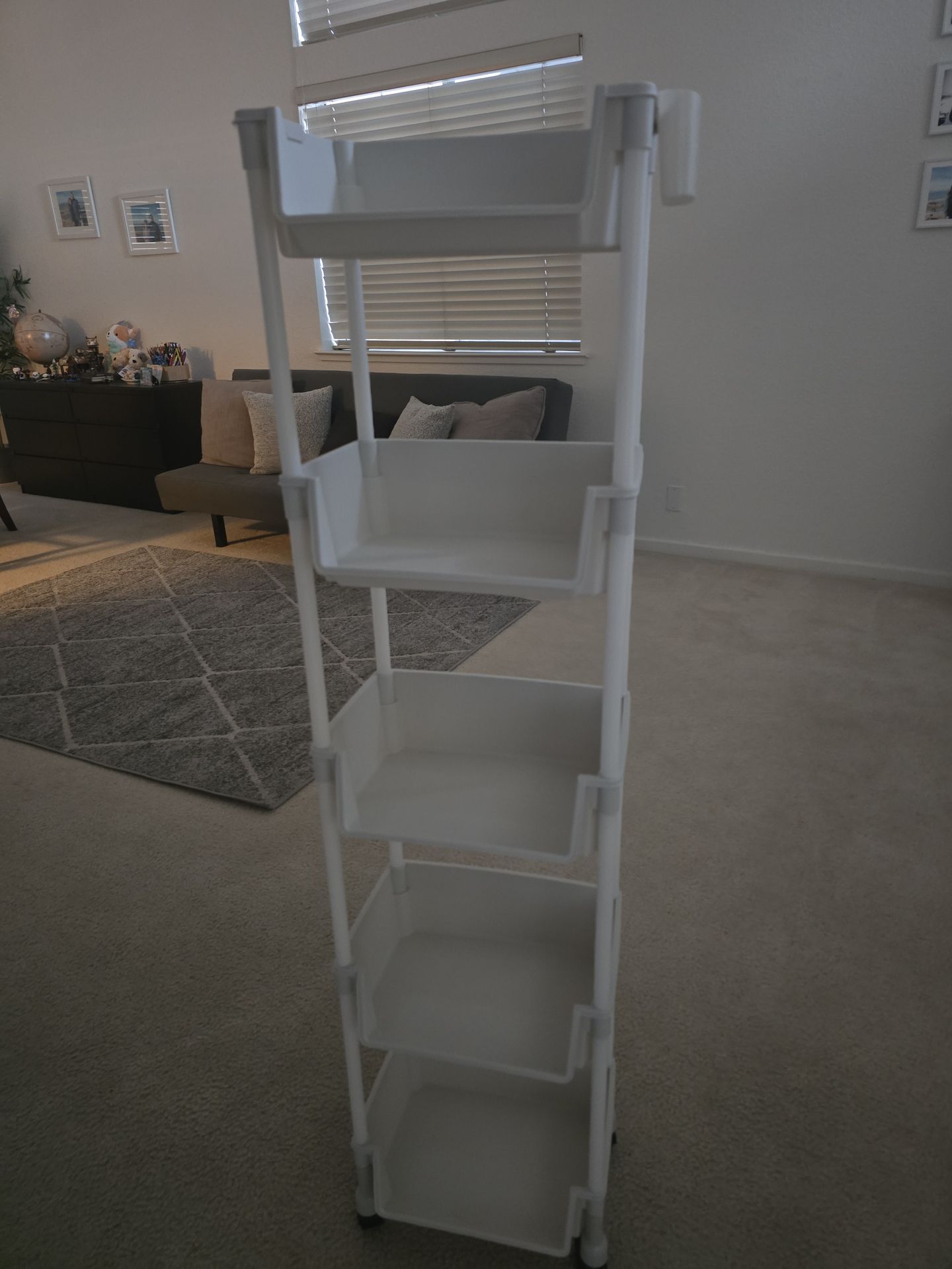 50in H. The bins can be removed. 12in L 9in W for size of bin Has wheels Light weight