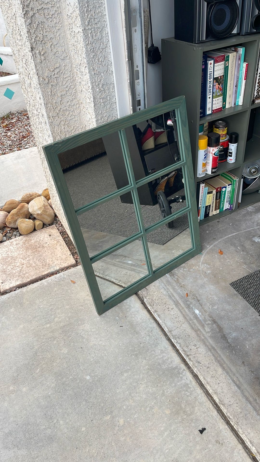 This is like a teal color, heavy duty mirror you could hang it up on the wall, put it on top of the cubby. It’s a good heavy duty wood also cubby is nine drawers you need bins or not you could do a bookshelf, TV stand, etc. with this painted we painted it you can paint it as well. Flamingo and Fort Apache asking 40 bucks for both.