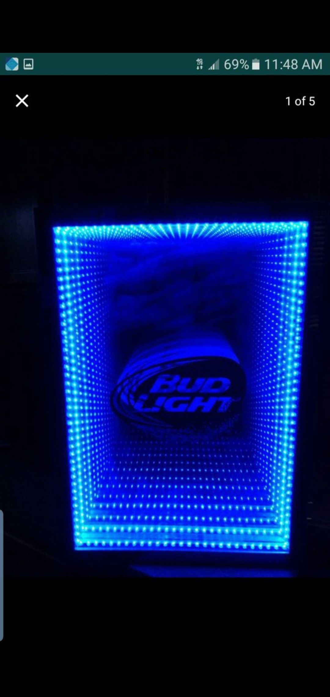 BRAND New Bud Light Infinity LED Mirror. What's cool about this 3D Mirror is that either you can have the blue led on all the time or the light will blink with the sound of music or any other sounds. Has a Brightness dial and a Sound sensitivity dial 24" tall x 17" wide. In original box asking $150 pick up only in Kenosha