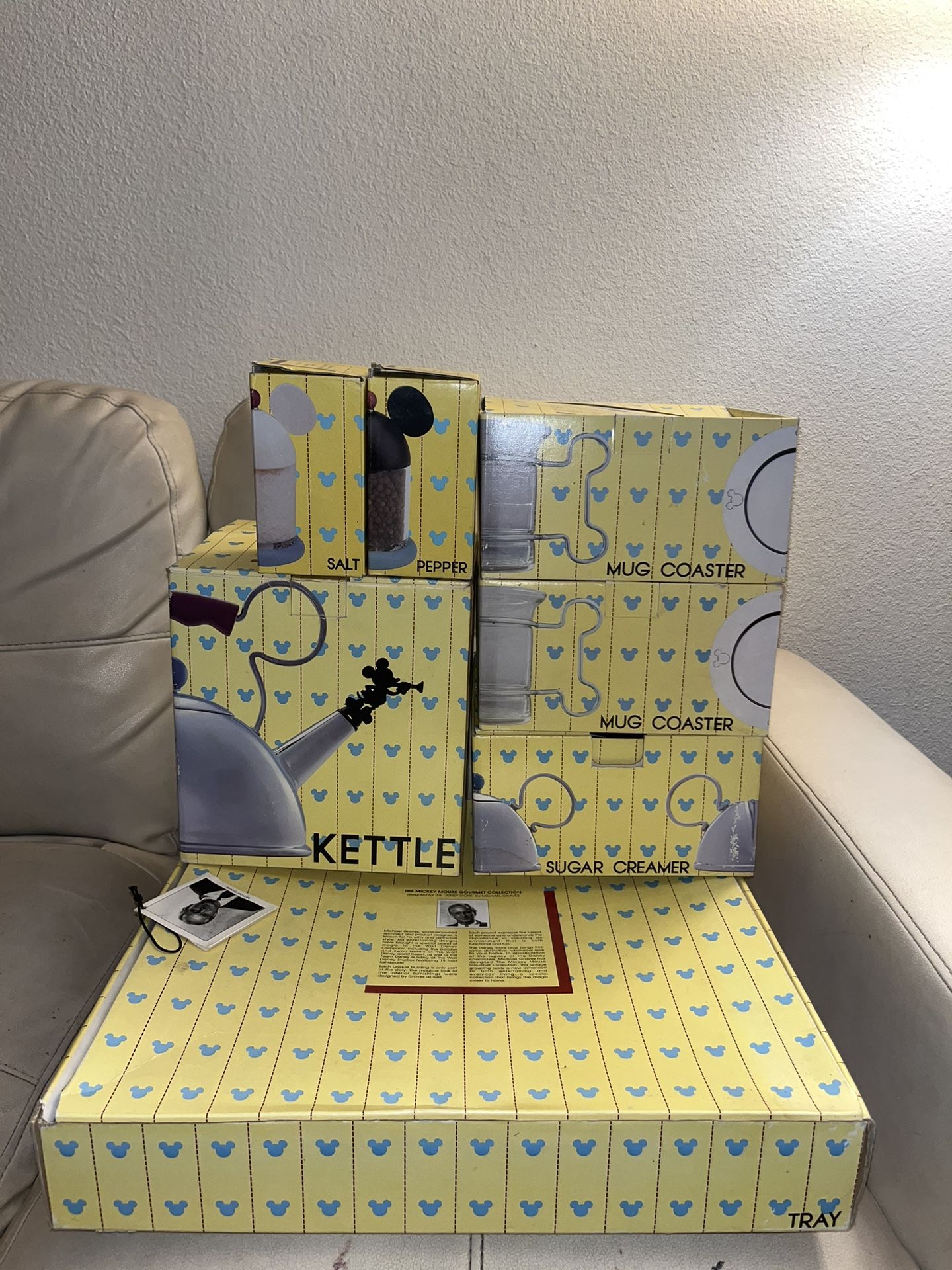 all brand new with receipt from 1994 includes everything pictured - Tea kettle - Serving tray - 2 Mugs 2 Coasters - Sugar And Creamer Mixers