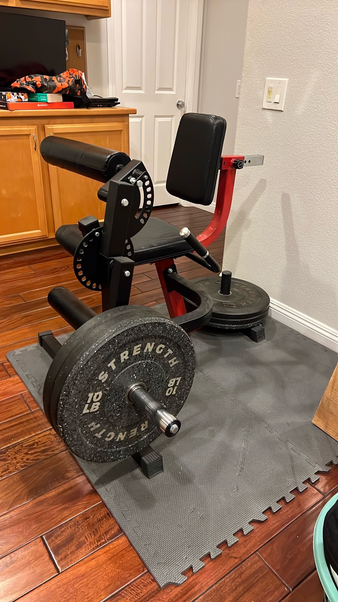 Seated leg extension/curl machine with 100lb plate weights. 2-25lb rubber plates 2-15lb rubber plates 2-10lb rubber plates All equipment is in excellent condition. You must move it. Yes, it’s heavy. Bring a truck.