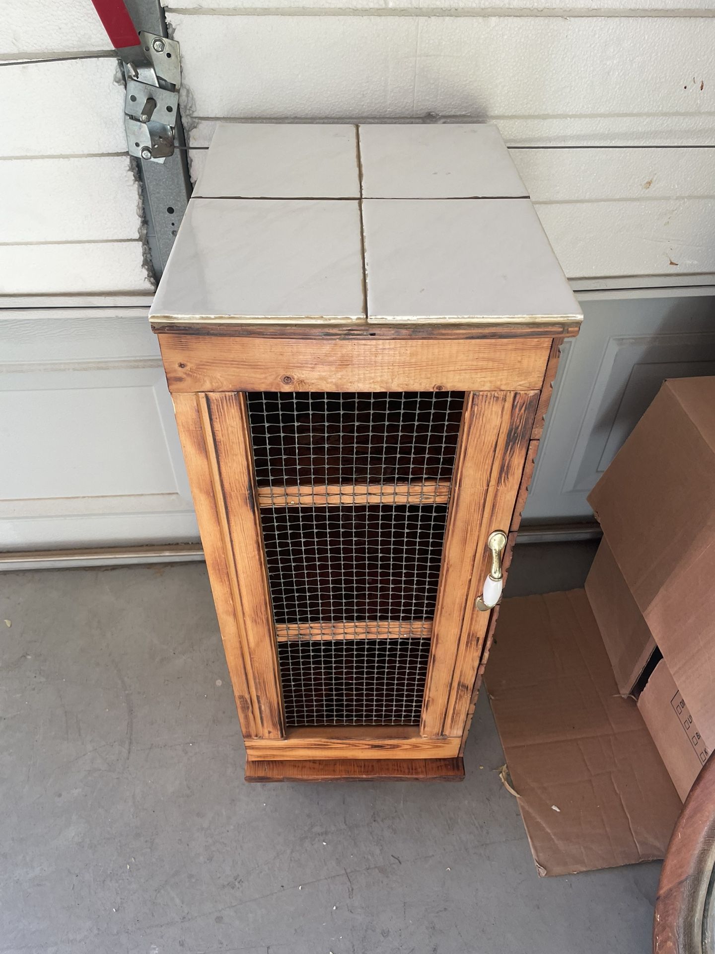 VTG Farmhouse Rolling Wood Cabinet-Pantry-Pie Safe-Wire Mesh Door