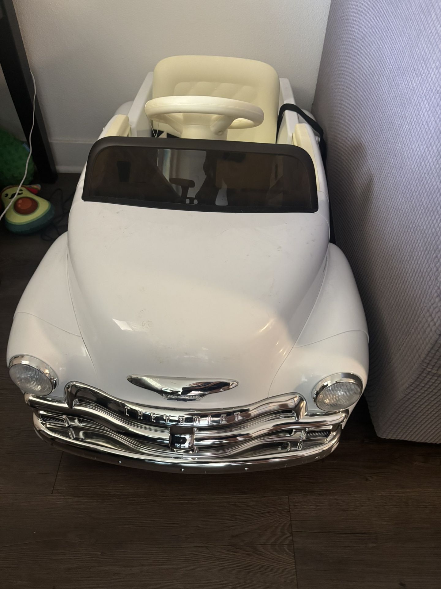 Adorable vintage-style Chevy battery-powered ride-on car 🤍✨ Only used a couple of times — basically like new!! • Battery-powered (runs smoothly!) • Parental remote control included 🎮 (full control for safety) • Built-in radio + Bluetooth connection 🎶 • Includes charger 🔌 • Has seatbelt for safety • Minor surface marks that can easily be wiped clean • Super cute vintage look — perfect for photos + everyday play Only selling because it’s no longer being used 💔