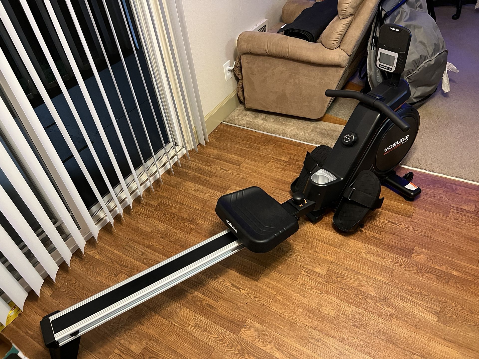 Like new Quiet When Used > You can hardly hear any noise when you using it. Features Include >Monitor screen for workout data, tablet/phone holder, cup holder, nonslip pedals w/adjustable straps, ergonomic seat, adjustable resistance up to 16 levels, supports up to 350 lbs Easy to Move Around >You just need lift the rowers then you can move it anywhere with two wheels on the front stabilizer *Pick up only