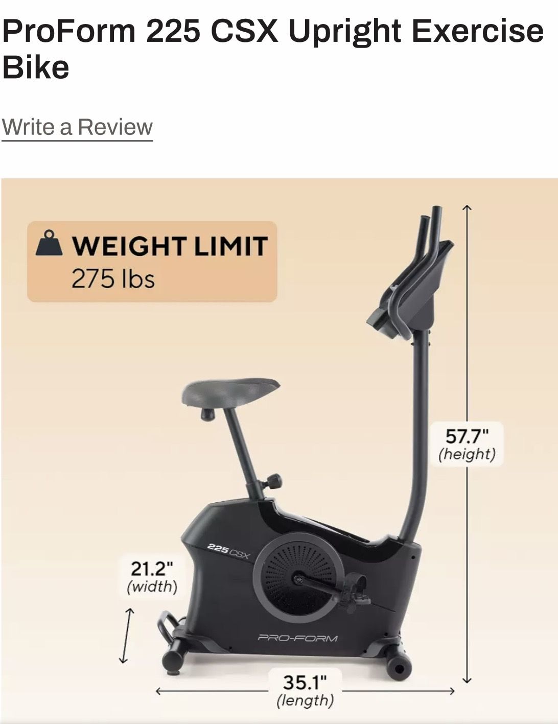 ProForm 225 CSX stationary exercise bike with digital display. Like new! REDUCED from $325 FOR QUICK SALE 20 levels of digital resistance, like new Rated 5 stars, excellent reviews Dimensions: 35” x 21” x 57” Maximum user weight 275# Has USB-C charging port, Bluetooth headphone connectivity, 2-2” premium speakers, 5” HD touchscreen. Screen can welcome you with individual workout suggestions. Offers more than 10,000 on-demand workout programs and videos. Bike is exc, Very Quiet & easy to use. Bluetooth heart-rate monitoring. Compact Steel frame, very heavy duty. Fist come, Cash only. Will delete when sold. Cash only, Parkland area