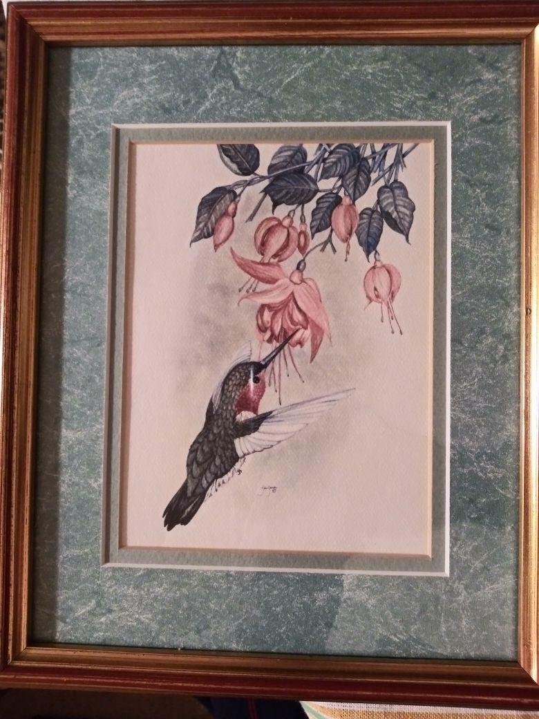 Item offered is a set of three lovely framed and double matted prints of hummingbirds by Northern California wildlife artist Marilyn ZarZana Dixon (1948 - 2006). Frames measure apx. 9" x 11" x 1" with a standard 8" x 10" opening. I'm asking $21 for the set of three in frames. If you prefer unframed, I'm willing to sell the prints with mats for $15, and I'll keep the frames. Prints, mats, and frames are in like new condition- very minor blemishes. Matting is in a teal green. Frames are antique gold painted wood, with red-brown accent stripe.