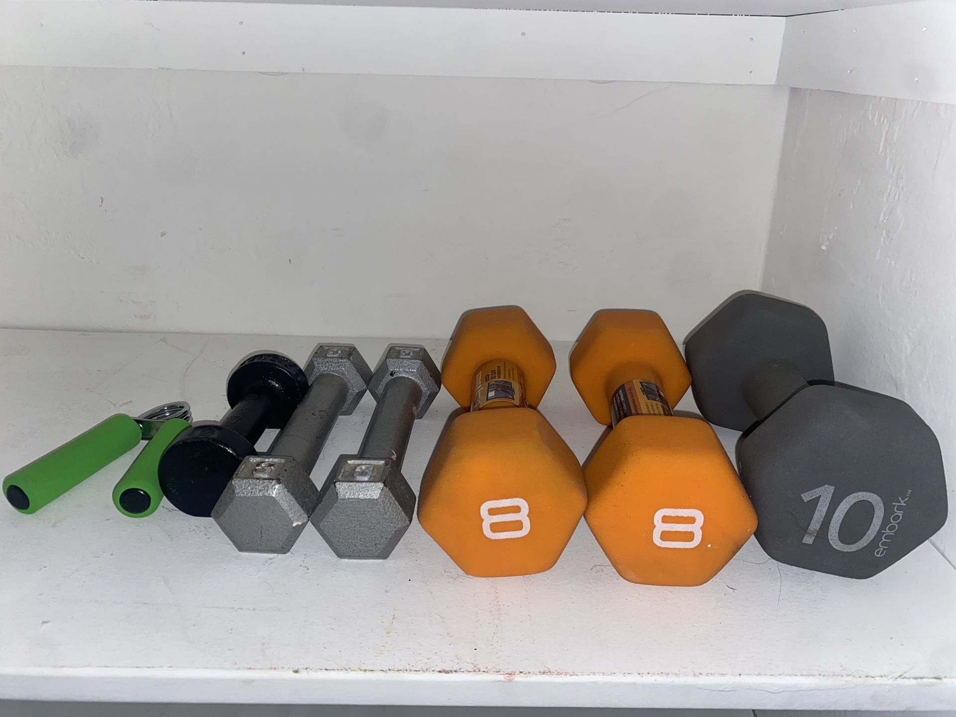 Weights Little to no use so passing them onto the next person :) 1 - 10 lb 2 - 8 lb 2 - 3 lb 1 - 2 lb Hand Grip All for $40