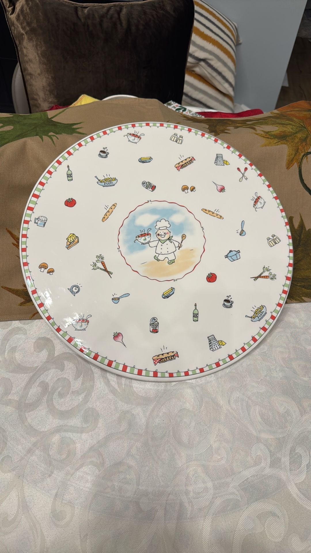 Ceramic pizza holder - 16” round with all kinds of details on it, i.e., pictures of cheese grater, tomatoes, bread, carrots, pasta, mushrooms, cheese, utensils, butter, wine, coffee, etc., etc. very cute.