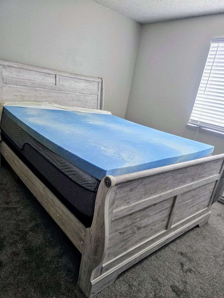 10" Coolsense Queen Gel Memory foam Mattress with 3" Coolsense Mattress topper and box spring & bed frame included! Bought this set brand new from Big Lots July 2024 & my apartment lease is up in July 2025, slept in it maybe 20x because im always out of town for work, had a waterproof mattress protector over topper/mattress the entire time, entire setup is practically new & still smells brand new, frame measurements are 89"x62". I paid $1300 for all of it brand new. THIS is and will be the most comfortable bed you've ever slept in, guaranteed!!!