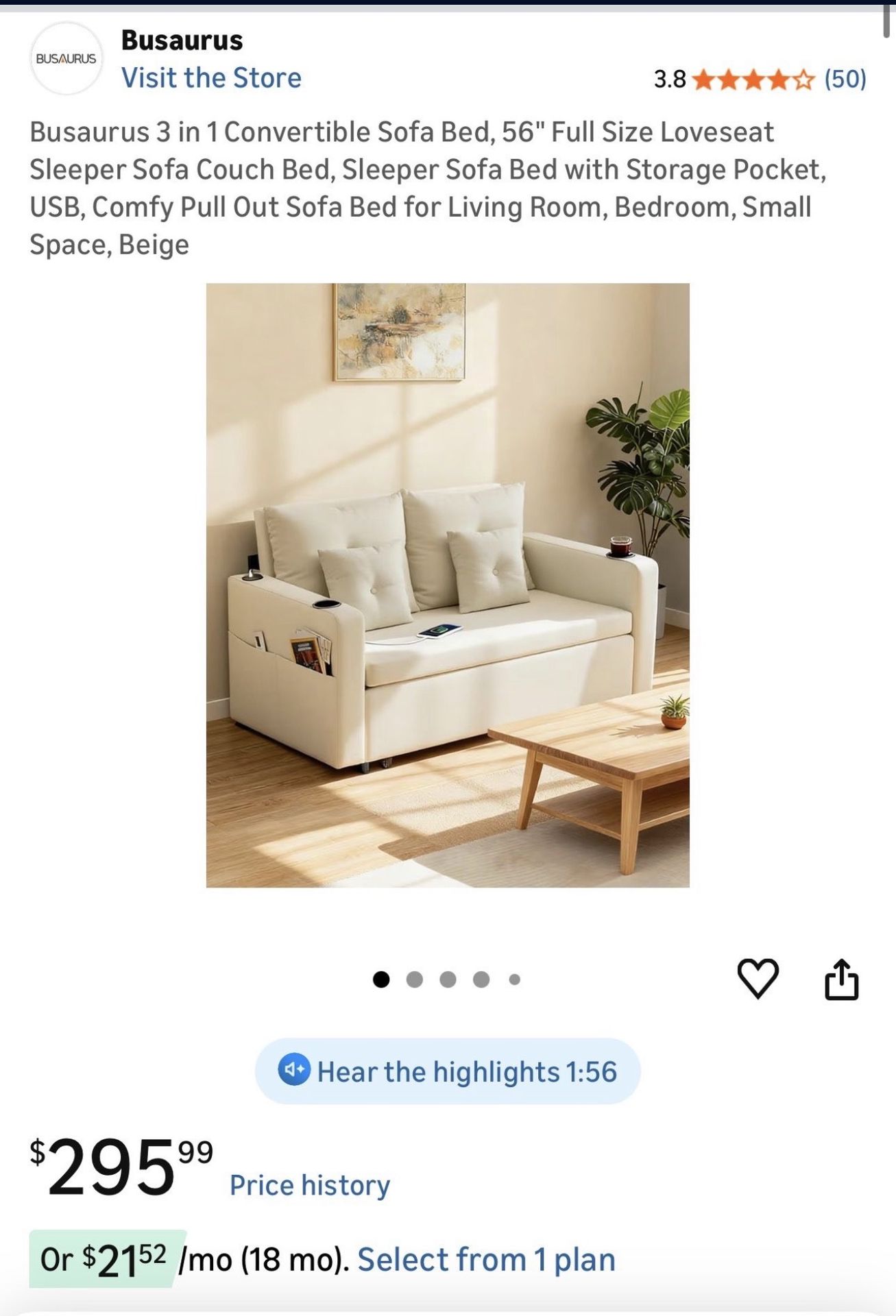 Like new 3 in 1 convertible sofa bed loveseat in beige. Purchased about six months ago and lightly used. Clean condition with no damage. Pull out sleeper bed converts easily from loveseat to bed. Includes storage pockets and built in USB charging ports. Compact size perfect for apartments, bedrooms, offices, or small spaces. Approximate dimensions 56 inches wide 31 inches deep 75 inches bed length when extended From smoke free home. Pickup only. Cannot deliver Need to sell asap