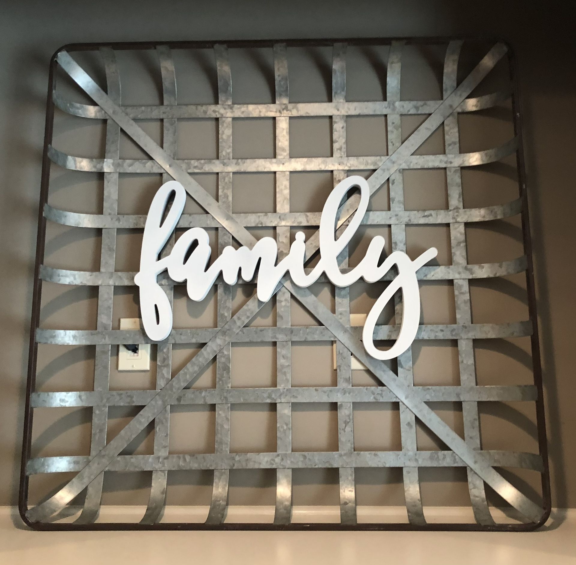 Galvanized metal tobacco basket plaque with removable “family” lettering. Basket measures 40 in. L x 40 in. H x 4.5 in. D
