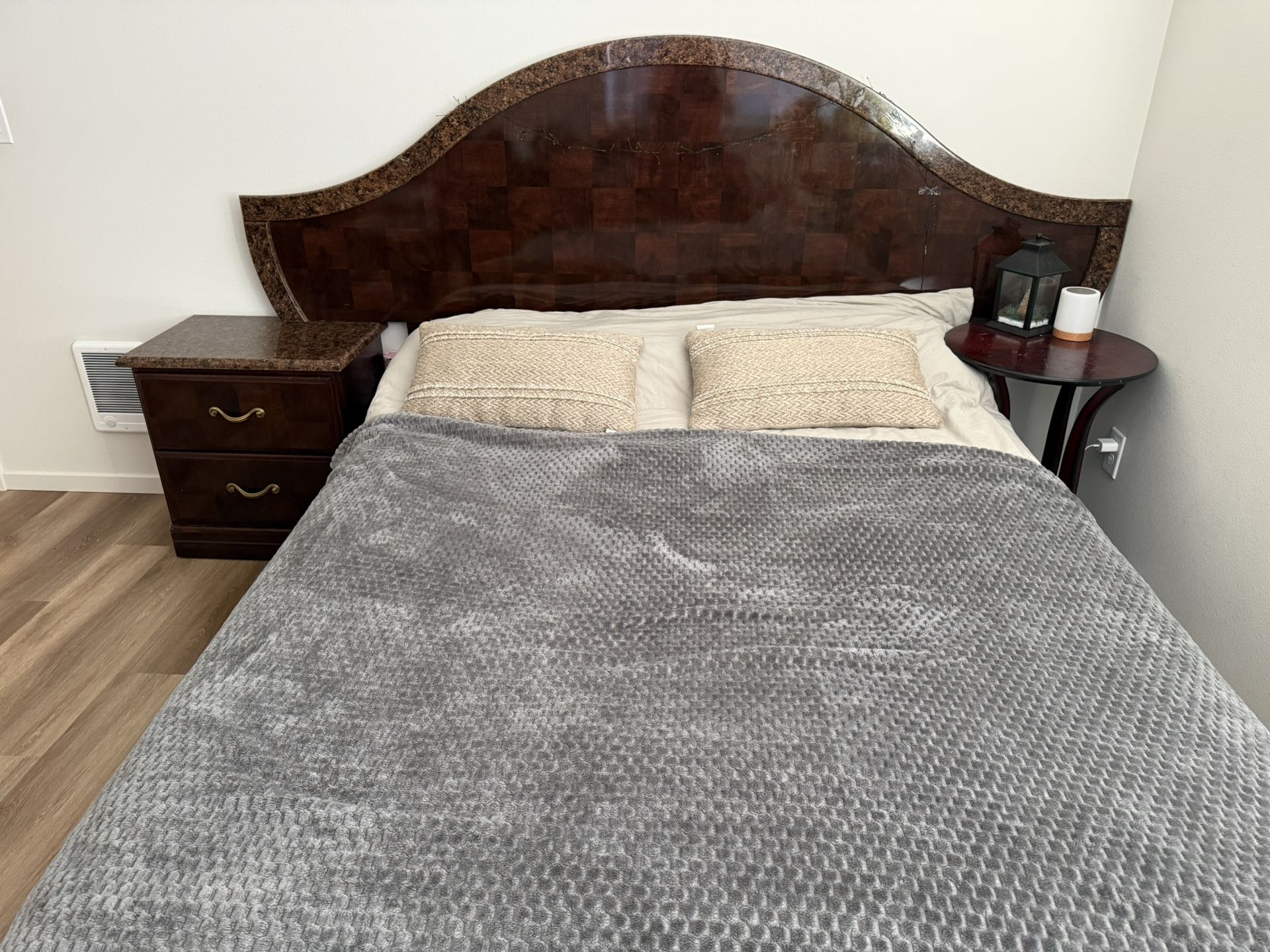 Bedroom Set for Sale Queen-size bed frame (no mattress included), 2 nightstands, and a dresser with mirror. All items are in good condition, clean and well maintained. Perfect for a bedroom in an apartment or house. Pickup only.