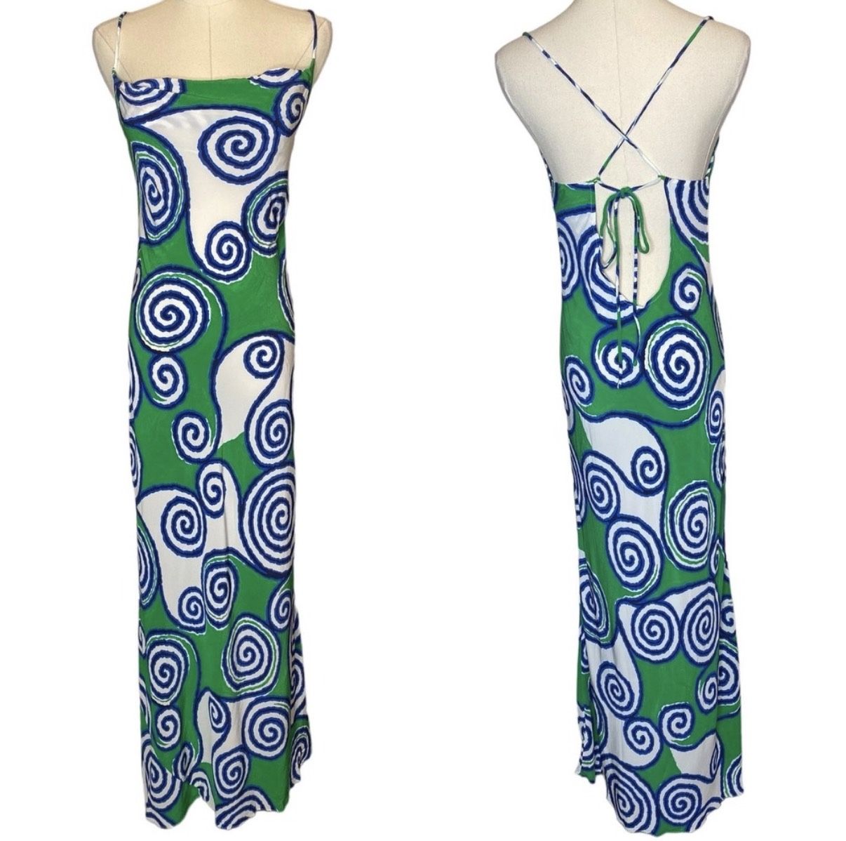 Rhode Jemima Swirl Maxi Slip Dress Lagoon Green size 8 Condition: Excellent, no blemishes The RHODE Jemima Maxi Dress features a fitted silhouette crafted of bias-cut satin in a graphic swirl print. A keyhole open back with adjustable spaghetti straps completes the look. Color: Lagoon Green Bias cut Fitted silhouette Square cowl neck Keyhole back with adjustable spaghetti straps Back tie closure 100% Viscose Cash only please :) Happy to work out a bundle deal - lmk if interested!