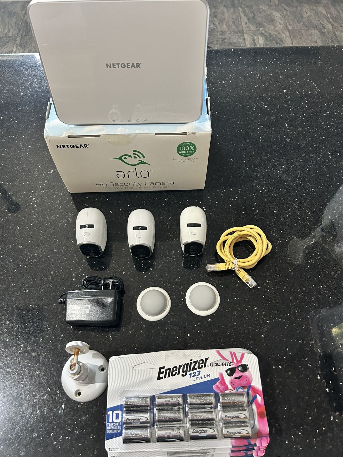 Arlo - Wireless Home Security Camera System | Night vision, Indoor/Outdoor, HD Video, Wall Mount | Includes Cloud Storage and Required Base Station | 3-Camera System (VMS3330) Include 5 packs of 12 Energizer batteries. Each pack costs $35. These battery should last at least a couple years for the cameras. The batteries themselves are worth more than $150 plus taxes. All are in excellent shape and working condition. Asking for $280 obo for everything. You save hundreds of dollars👍 No trade. Pickup near Lindsay & McKellips