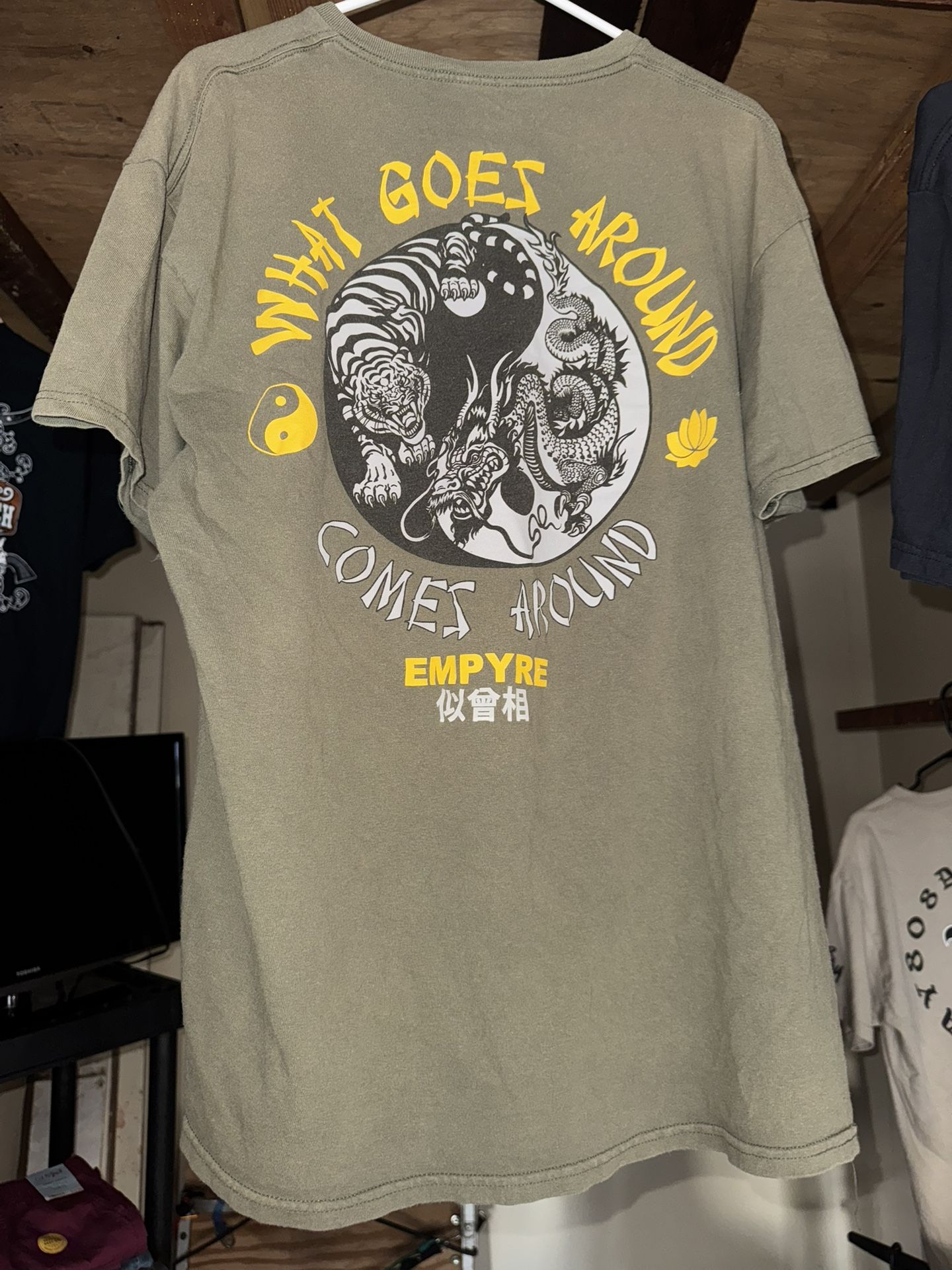 Empyre graphic tee in EXCELLENT CONDITION — size XL. Olive/earth-tone shirt with a bold tiger + dragon back print and “What Goes Around Comes Around” lettering. We’re listing a huge amount of items today — clothing, electronics, books, tools, home goods, and more. This is just one piece from a massive moving sale rollout. EVERYTHING MUST GO **IMMEDIATELY**. **NO HOLDS — FIRST COME, FIRST SERVE.** OTHER ITEMS AVAILABLE: 👕 Tons of men’s & women’s clothing 📚 Books & DVDs 🔌 Electronics 🍽️ Kitchen + houseware 🛠️ Tools 🪑 Nightstands, shelves, small furniture 🎁 Free items listed on our page PRICING: • 1–4 items: $1–$10 each • 5+ items: $2 per pound • 100+ lbs: $1 per pound Check our page for more listings + freebies. Pickup in McCully — message for address.