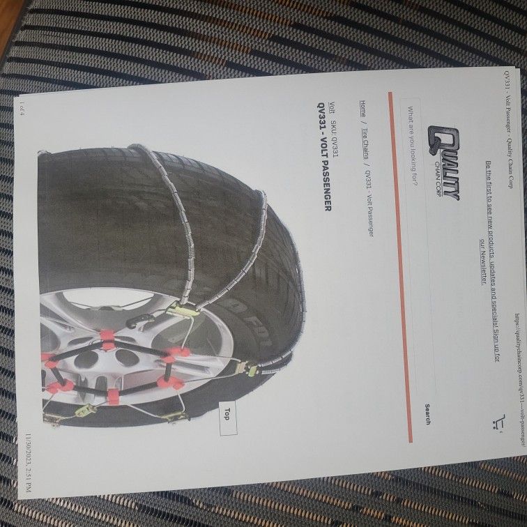 One pair of quality chain Corporation cable Tire chains. Never been used. Model number qv331-volt passenger. Tire size list is in the photographs. Cost me $125, First $50 cash takes them home.