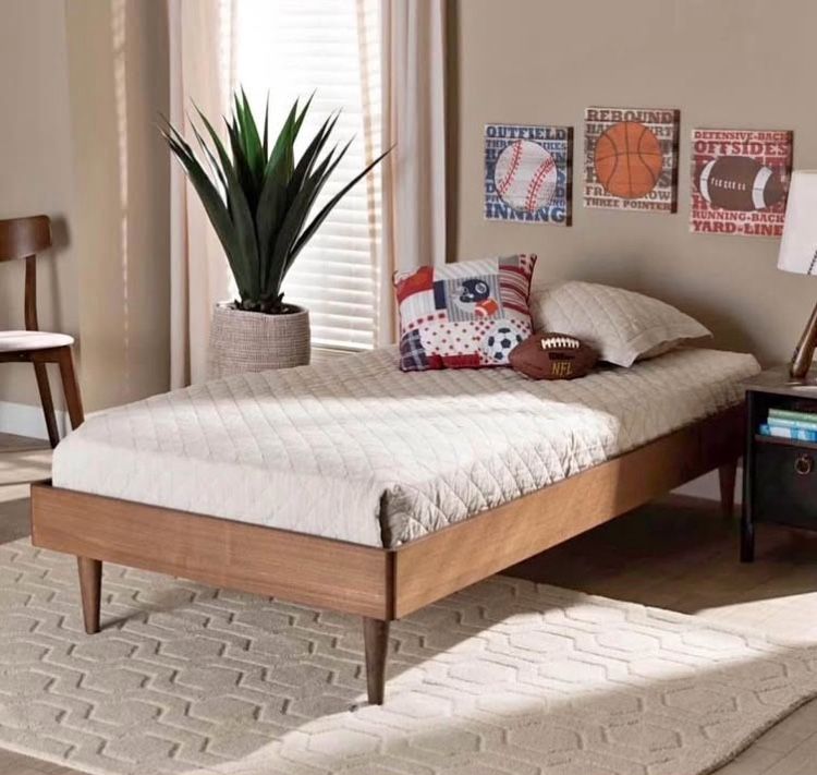 Wood Platform Bed, Twin, Ash Walnut, New in Box Mid-century modern bed frame• Constructed from solid rubberwood with MDF ash veneer, and LVL• Ash walnut finish• Tapered legs• Slats eliminate the need for a box spring• Assembly required• Made in Malaysia• Product Weight: 51.1 Pound• Package Weight: 57.8 Pound• Dimensions: 14.9" High(from Floor to top of footboard) x 40.55" Wide x 78.2" Deep; Distance between each slat: 3.1"; Height from Floor to Top of Slat: 12.4" High; Legs: 10" High; Inside Dimensions (mattress size): 39" Wide x 76" Deep;• Product Color: Ash Walnut• Product Composition: MDF/Rubberwood