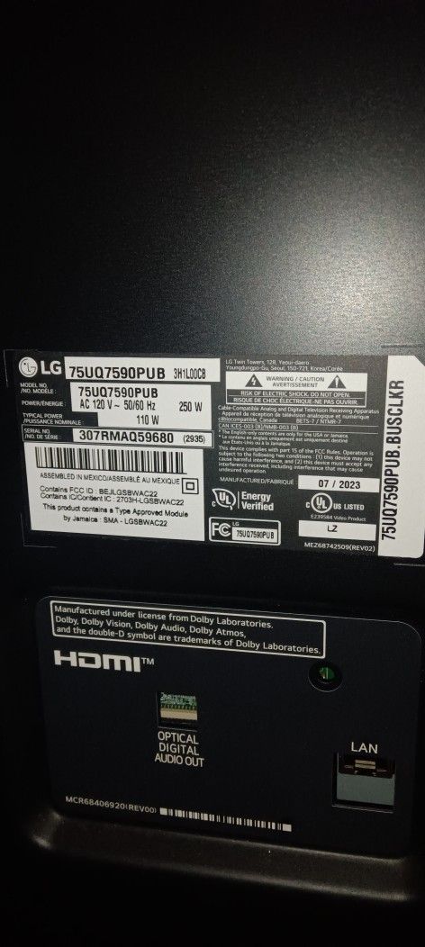 Motherboard for a 75" LG smart TV. Hdmi/AV plugs, wires & speakers included. In perfect condition. Model # in pics
