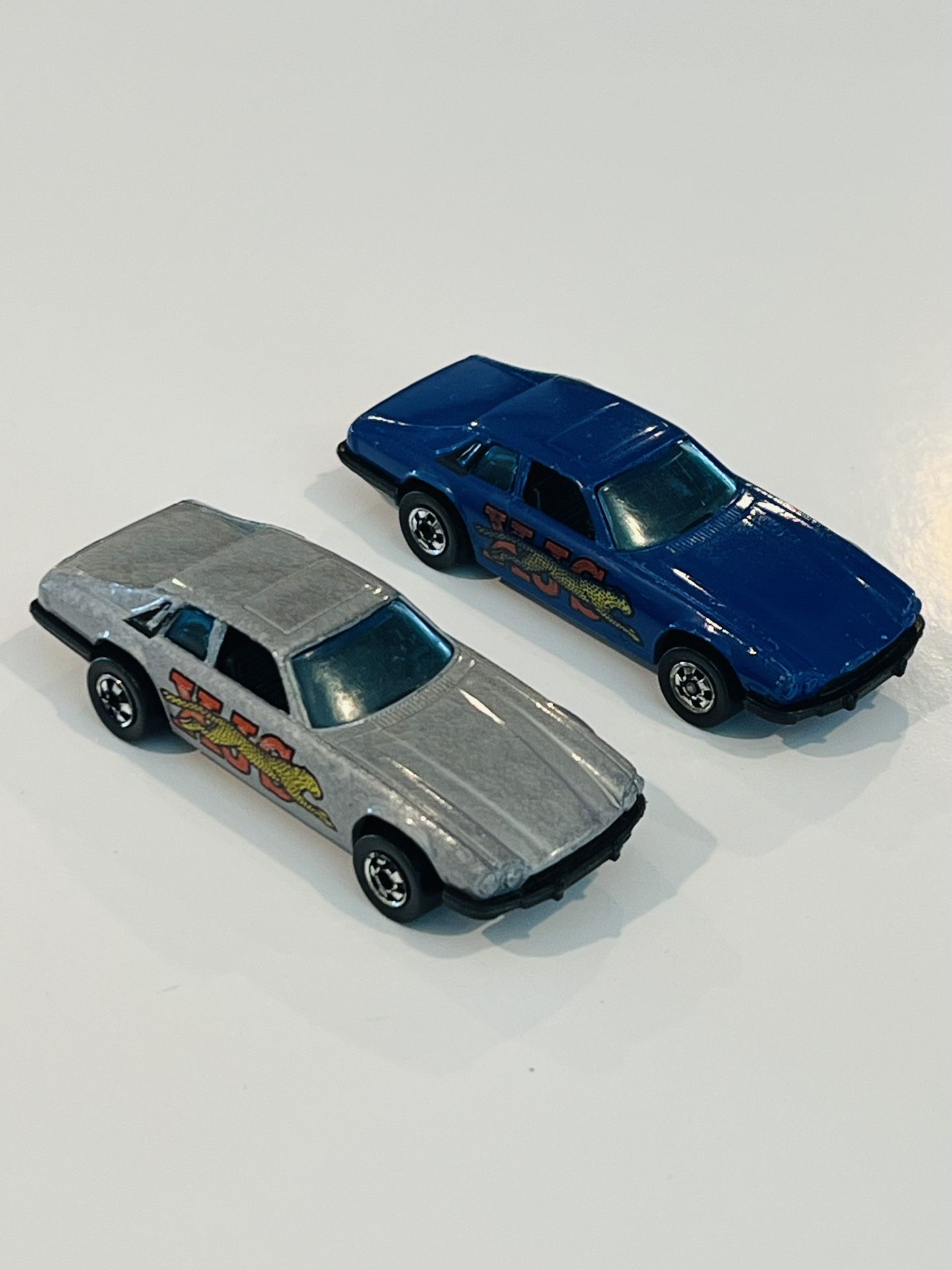 These Hot Wheels Jaguars were made in Hong Kong and Malaysia and are in really good used condition overall. 1978 Gray Flying Colors - Hong Kong 1980 Dark Blue Mainline - Malaysia